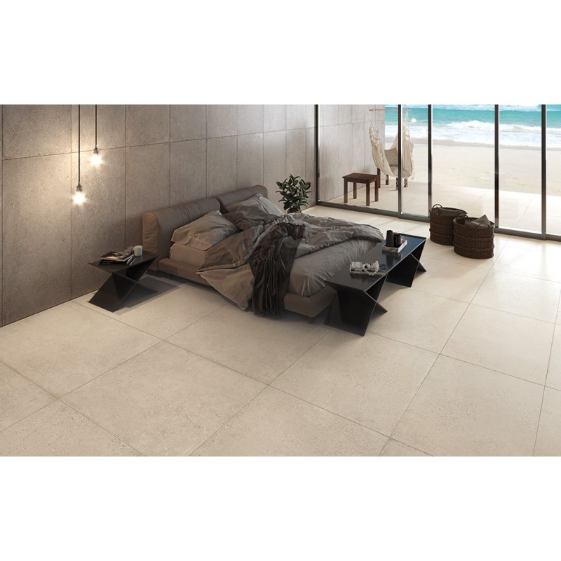 Pavimento in gres porcellanato effetto cemento beige, adatto alla posa in ambienti interi.