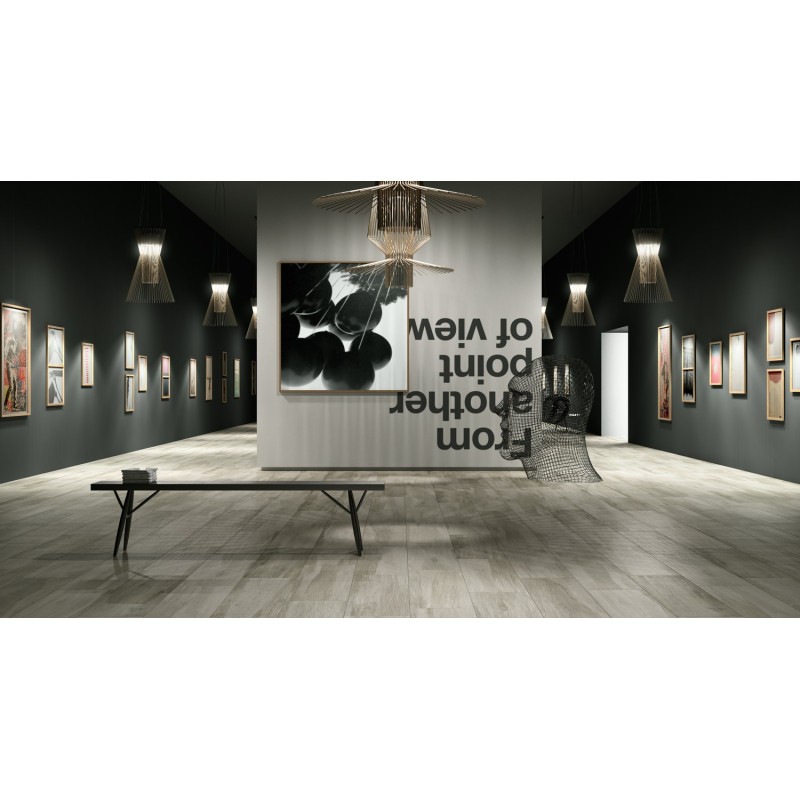 Pavimento in gres porcellanato effetto legno grigio, adatto alla posa in ambienti interni.