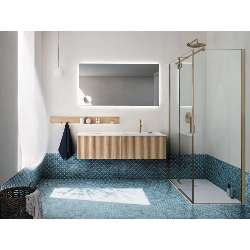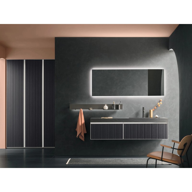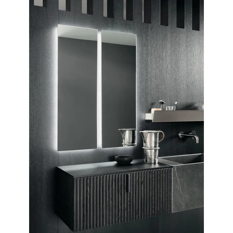 L’illuminazione LED perimetrale a 4000 K diffonde una luce naturale e uniforme, perfetta per accompagnare i gesti quotidiani e valorizzare lo spazio.a versione senza interruttore mantiene un’estetica essenziale e pulita, e può essere installata sia in verticale sia in orizzontale sopra il lavabo.